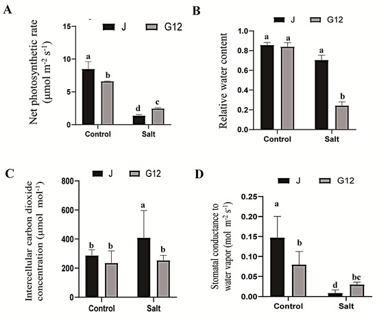 Physiological responses of mulberry to salt stress. (A) Net photosynthetic rate of mulberry leaves in both J and G12 groups. (B) Relative water content in both J and G12 groups. (C) Intercellular carbon dioxide concentration in both J and G12 groups. (D) Stomatal conductance to water vapor in both J and G12 groups. Data are means ± SD with three biological replicates. Different letters represent statistically significant differences between control and salt treated plants by Duncan’s multiple range test (p < 0.05). Jck, JS, G12ck and G12S represent the two states of Jisang3 and Guisangyou12 under control and salt stress, respectively.