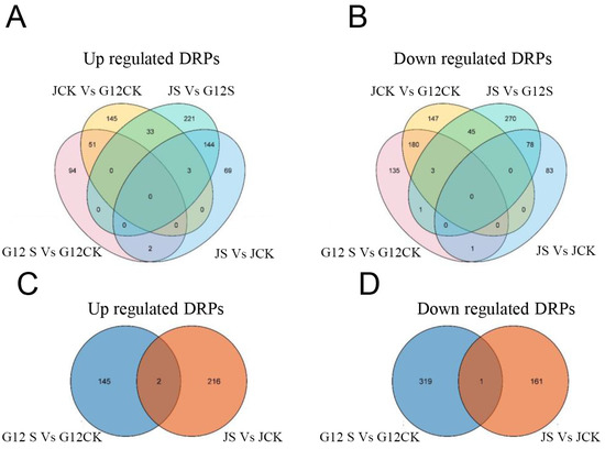 Analysis of Venn diagram. (A,B) Venn diagram of differentially expressed proteins identified at different treatments. (C,D) Venn diagram of differentially expressed proteins identified between Jisang3 and Guisangyou12 in the saline condition.