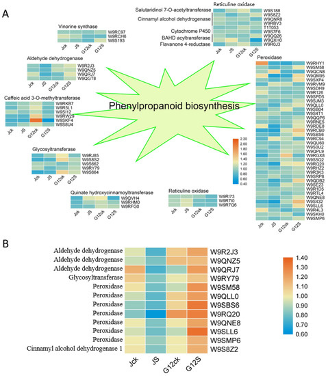 Heatmap of proteins involved in phenylpropanoid biosynthesis pathway. (A) Heatmap of proteins identified in phenylpropanoid biosynthesis pathway. (B) Heatmap of DRPs involved in phenylpropanoid biosynthesis pathway. Red represents a high gene expression level and blue represents a low gene expression level.