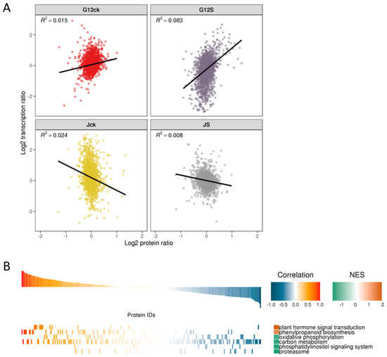 To further characterize the transcriptome profiles under salt stress, genes involved in salt stress in the two varieties were further screened through RNA-Seq. There were 24,448 genes identified and 4009 genes were both annotated in transcriptome and proteome (Figure S8). The transcriptomic and proteomic data describe the expression of genes at the transcription and translation levels, respectively. In addition to the one-to-one correspondence between transcriptome and proteome, there are other more complex regulatory relationships. Shown in Figure 6A is a scatter plot between the sample’s transcript and its corresponding protein expression. By comparing the quantitative correlation between the two omics, we found that there was a positive regulatory relationship between the protein and the transcript in Guisangyou12 under salt stress while there was a negative regulatory relationship in Jisang3. We further performed the GSEA analysis (Figure 6B) based on KEGG pathway through the above overall analysis of the quantitative correlation between the transcriptome and the proteome. The result showed that there was obvious positive regulatory relationship between the transcriptome and the proteome such as plant hormone signal transduction and phenylpropanoid biosynthesis. Additionally, there were still some negative regulatory relationships between the protein and the transcript such as oxidative phosphorylation, carbon metabolism, phosphatidylinositol signaling system and proteasome. In order to explore the potential relationship between gene transcription level and protein level under multiple experimental conditions, the protein group and transcriptome expression data sets were merged. Then, we used the hclust “ward.D” method to cluster the expression of genes in two dimensions (Figures S9 and S10). The abscissa is the sample in the quantitative study of the proteome and transcriptome, and the ordinate is the protein or transcript quantified in the two omics at the same time. Through the hclust clustering method, these proteins or transcripts were divided into six categories. There is a specific relationship between protein and transcript expression in each category. Preparation of whole transcriptome libraries and deep sequencing were performed by the Annoroad Gene Technology Corporation (Beijing, China).