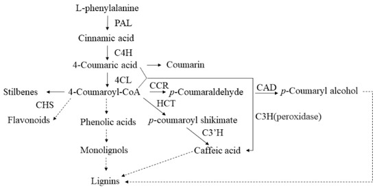 A part scheme of phenylpropanoid metabolism. 4CL, 4-coumarate-CoA ligase; C3H, coumarate 3-hydroxylase; C3′H, p-coumaroyl shikimate 3′ hydroxylase; C4H, cinnamic acid 4-hydroxylase; CAD, cinnamyl alcohol dehydrogenase; HCT, Hydroxycinnamoyl-CoA shikimate/quinate hydroxycinnamoyl transferase; CCR, cinnamoyl-CoA reductase; CHS, chalcone synthase; PAL, phenylalanine ammonia-lyase.