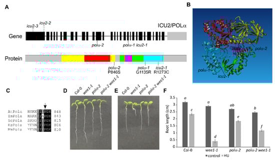 When WEE1KO plants are grown on a medium containing HU, they show strong inhibition of root growth []. An ethyl methanesulfonate (EMS) mutagenesis screen was performed to identify mutations that can rescue this root growth inhibition. One of the revertants found was line 113–2, which showed improved root growth on HU compared to wee1-1 plants. By outcrossing this line to a wee1-1 mutant line in Landsberg erecta background, a mapping population was obtained that could be used for next-generation sequencing-based mutation mapping using the SHORE pipeline coupled to the SHOREmap algorithm []. The causal mutation of line 113–2 was mapped to a genomic region on the lower arm of chromosome 5, more exactly to the At5G67100 gene, where it leads to the nonsynonymous P846S amino acid change (Figure 1A). The mutation was confirmed in the original 113–2 line by direct Sanger sequencing (Figure S1). The At5G67100 gene, also known as INCURVATA2 (ICU2), encodes the catalytic subunit of the DNA polymerase α, therefore we named this new mutant allele polα-2. When modeled to the human polymerase α structure [], the polα-2 mutation appears to be located on the border of the hinge between the N-terminal domain (yellow in Figure 1A,B) and the palm domain (green in Figure 1A,B), which is an unstructured and thus uncharacterized region of the protein (grey in Figure 1A), but the protein sequence of the region directly surrounding the mutation is conserved in all eukaryotes (Figure 1C).