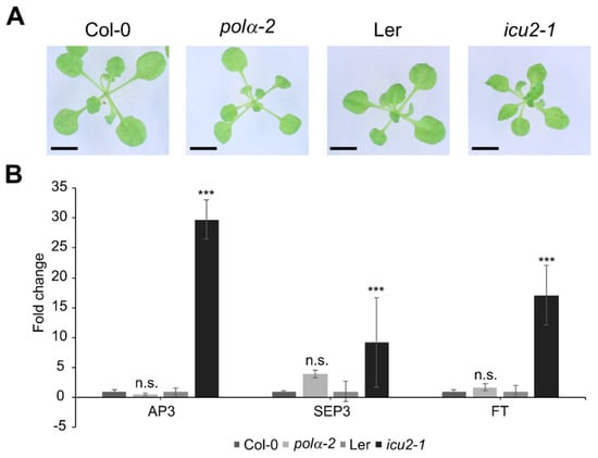 A previously reported mutation in the INCURVATA2 gene, icu2-1, has been described as having curled leaves (hence the name), which is caused by the epigenetic deregulation and thus ectopic expression of flowering genes such as APETALA3 (AP3), SEPALATA3 (SEP3), and FLOWERING LOCUS T (FT) in the leaves []. A very similar phenotype is attributed to another allele of polymerase α, polα-1 []. When these mutations are modeled to the human polymerase α structure, they are both located in the thumb domain (Figure 1C). We compared the icu2-1 mutant (Landsberg erecta background) leaf phenotype with that of the polα-2 mutant under control conditions. In contrast to icu2-1, a curled leaf phenotype is absent in the polα-2 mutant (Figure 2A). Moreover, as reported before [], flowering genes such as AP3, SEP3, and FT are significantly upregulated in the leaves of the icu2-1 mutant, but not in the polα-2 mutant (Figure 2B).