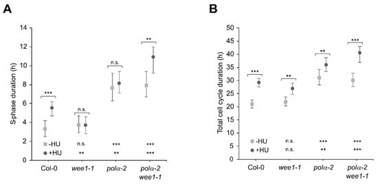 Cell cycle parameters of Col-0, wee1-1, polα-2, and polα-2 wee1-1 root tip cells under control conditions and treated with HU. (A,B) S-phase (A) and total cell cycle (B) duration were measured using a time course of EdU staining according to the protocol of Hayashi et al. []. Data represent the mean ± 95% confidence intervals (n.s., not significant; ** p < 0.01; *** p < 0.001). For S-phase duration, comparisons were tested using ANOVA with Tukey correction. Total cell cycle duration was tested using ANOVA with F-tests to statistically test the equality of the means (n > 5). As inset, significance is depicted for each treatment of the comparison with Col-0.