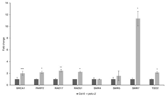 Additionally, in Col-0 and polα-2 untreated root tips, we evaluated the expression of DDR-related genes through qRT-PCR. All genes associated with DNA repair (BRCA1, RAD51, PARP2, RAD17 and TSO2) were upregulated in polα-2 compared to Col-0, indicating the presence of endogenous DNA damage in polα-2 (Figure 4). Among the tested DNA-damage responsive cell cycle inhibitors SMR4, SMR5, and SMR7 [], only SMR7 was upregulated (Figure 4).