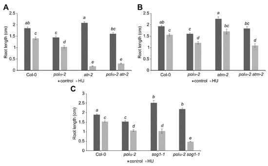The polα-2 mutation does not confer tolerance to replication stress in other DDR regulator mutant lines. Quantification of root growth of 7-day-old (A) wild-type (Col-0), polα-2, atr-2, and polα-2 atr-2 seedlings, (B) wild-type (Col-0), polα-2, atm-2, and polα-2 atm-2 seedlings, or (C) wild-type (Col-0), polα-2, sog1-1, and polα-2 sog1-1 seedlings grown on control medium or medium supplemented with 0.75 mM HU. Data represent the mean ± SEM (n > 8). Significance was tested with mixed model analysis. The means with different letters are significantly different (p < 0.01).