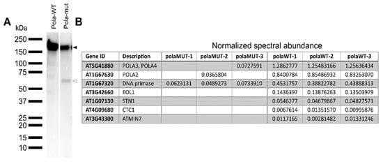 TAP-MS analysis was performed as described previously []. Briefly, the plasmids expressing Pola-WT and Pola-MUT fused to the double affinity GSrhino tag [] were transformed into Arabidopsis (Ler) cell-suspension cultures. TAP purifications were performed with 200 mg of total protein extract as input and interacting proteins were identified by mass spectrometry using a Q Exactive (Thermo Scientific, Waltham, MA, USA) orbitrap. Proteins with at least two high-confidence peptides were retained only if reproducible in two experiments. Non-specific proteins were filtered out based on their frequency of occurrence in a large dataset of TAP experiments with many different and unrelated baits as described []. For Western blot analysis, 50 µg of total protein extract was separated in 4–15% Mini-PROTEAN TGX Precast Protein Gel (Bio-Rad, Hercules, CA, USA), transferred to a PVDF membrane using Trans-blot turbo transfer packs (Bio-Rad, Hercules, CA, USA), and membranes were incubated overnight at 4 °C with 3% skimmed milk 1x TBST solution. GSrhino-tagged proteins were detected with peroxidase anti-peroxidase soluble complex antibody (1/2500).
