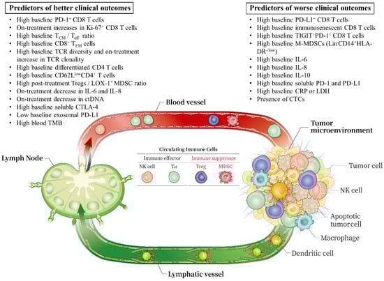 Other studies have revealed the potential role of TEM cells in predicting the clinical benefits of ICIs. In patients with melanoma treated with PD-1 inhibitors, a higher frequency of circulating CD8+ TEM cells and lower frequency of CD4+ TEM cells and naïve CD8+ T cells at baseline were observed in responders []. Consistent results were also reported in melanoma patients treated with the anti-CTLA-4 antibody, ipilimumab. Wistuba-Hamprecht et al. demonstrated that high frequencies of CD8 effector-memory type 1 T cells defined as CD45 RA− CCR7− CD27+ CD28+ in the peripheral blood within 4 weeks of treatment initiation were associated with higher clinical response and longer OS []. However, late stage-differentiated effector memory CD8 cells (CD45 RA+ CDR7−CD27−CD28−) were inversely related to OS. Furthermore, other researchers have simultaneously investigated the functional status and phenotype. Kim et al. reported that a lower frequency of CD8+ TEM cells and a higher frequency of severely exhausted T cells (TIGIT+ cells among PD-1+ CD8+ T cells) at baseline were associated with HPD and shorter OS in NSCLC patients treated with PD-(L)1 inhibitors [].
