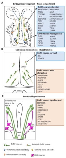 Schematic drawings illustrating the different phases of GnRH neuron development and associated CHH genes. (A) Embryonic development of GnRH neurons in the nasal compartment is orchestrated by neurodevelopmental genes (blue box) regulating either the neurogenesis or the migration of GnRH neurons. (B) Embryonic development of GnRH neurons in the MPOA of the hypothalamus is controlled by both neurodevelopmental (blue box) and neuroendocrine (red box) genes mainly implicated in GnRH neuron survival and axon elongation, respectively. (C) GnRH neuronal function in the hypothalamus is mediated by neuroendocrine genes (red box) controlling GnRH secretion or signaling. Abbreviations: VNO, vomeronasal organ: OE, olfactory epithelium; MOB, main olfactory bulb; AOB, accessory olfactory bulb; MPOA, medial preoptic area; ME, median eminence; ARC, arcuate nucleus; 3v, third ventricle.