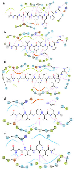 The Build Panel of Maestro (version 11, Schrödinger, LLC., New York, NY, USA) was used to construct the 3D structures of 2–6, and successively optimizing their geometries through: OPLS3 force field [20], Polak-Ribière conjugate gradient algorithm (maximum derivative <0.001 kcal/mol), GB/SA (generalized Born/surface area) [21] solvent treatment of H2O. Then, the peptides were processed by LigPrep [22], accounting for the protonation states at pH of 7.0 ± 1.0. Protein Preparation Wizard [23,24] was employed to process the X-ray structure of Mpro (PDB ID: 6LU7) [12]: bond order assignment and hydrogen addition; missing side chain and loop check; check of alternate positions of the residues, side chain charge assignment at pH 7.0 ± 1.0; H-bond network improvement through the optimize preference. The H2O molecules were removed. Molecular docking predictions were carried out by Glide (v. 7.2, Schrödinger, LLC., New York, NY, USA), by using peptide specific protocol (SP-PEP) [25]. The docking protocol was validated by redocking the co-crystallized N3 with Mpro and overlapping the docked and experimental poses (Figure S9; RMSD = 1.076 Å). The receptor grid, proper for peptide docking, was sized as 10 Å inner and 22 Å outer boxes, with a center coordinates: −10.80 (x), 12.53 (y), 68.70 (z). A first set of SP-PEP was carried out by means of default parameters, with extended sampling option for conformer generation and expanded sampling for initial pose selection. 100 poses for 2–6 were generated, treating the ligands as flexible allowing only trans conformation for amide bonds. The following scoring contribution were considered: Epik state penalty; reward of intramolecular H-bonds; and aromatic hydrogen. The 2–6 docked poses obtained from the first calculation run were used as starting conformations for a second round by means of the same parameters generating 100 conformations for each input one. All 10,100 conformations from the first two calculation sets were collected and classified by docking score, and the best 100 ranked conformers were used as input for a third round of predictions generating further 10,000 docked poses. Predicted apparent Caco-2 cell permeability (QPPCaco) was calculated by QuikProp of Schrödinger suite [17], using default parameters and Caco-2 cells as model.