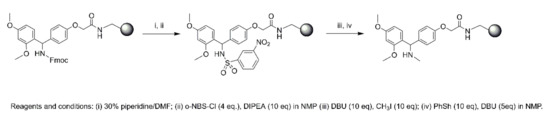 Peptides were synthesized onto a Rink Amide-resin (150 mg, loading 0.71 mmol/g), previously deprotected with 30% piperidine/DMF (1 × 3 min, 1 × 10 min) at room temperature. The resin was then washed with DMF (4 × 4.5 mL) and the primary amino group was protected and simultaneously activated by reacting it with o-NBS-Cl (4 eq) and DIEA (10 eq) in N-methyl-2-pyrrolidone (NMP) overnight. After this step, the methylation was carried out by treating the resin with DBU (10 eq, 30 min) and CH3I (10 eq, 30 min) in NMP (2×). Then, the o-NBS protecting group was removed with thiophenol (10 eq) and DBU (5 eq) for 30 min. All steps were performed at room temperature. The synthesis was then performed as described above.
