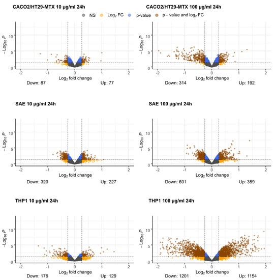 Gene expression volcano plots for different cellular models and TiO2-nanobelt concentrations. On the x-axis log2 (fold change) is depicted whereas on the y-axis the -log10 (p-value) is depicted. The dotted lines represent cut-off values for significantly changed genes (log2 fold change > 0.26 or <−0.26, p-value < 0.05). A brown color depicts that a gene meets both cut-off criteria, a blue color relates to meeting only the p-value cut-off, an orange color relates to meeting only the log fold change cut-off, and a gray color indicates that a gene does not meet any of the criteria.