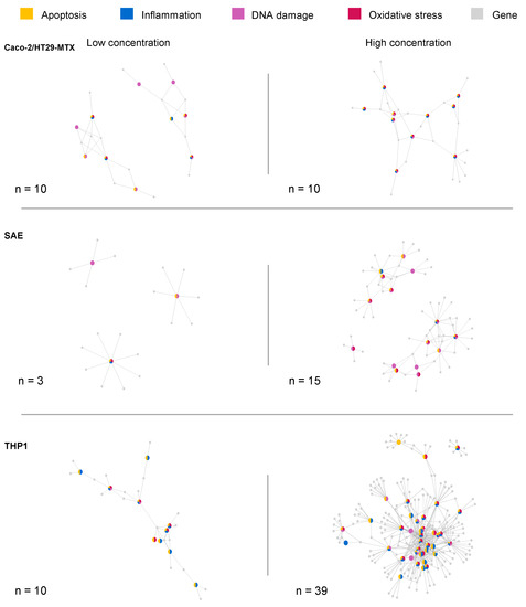 To study the detailed mechanisms of the cellular response, bioinformatics and systems biology approaches, including pathway and network analysis, have been used to assess the effects on toxicity-related processes upon exposure to TiO2-nanobelts, i.e., reactive oxygen species formation and oxidative stress, apoptotic cell death, inflammation, and DNA damage [29,30]. Pathway enrichment analysis helps to put high-throughput omics data such as transcriptomics into a biological context [31] and the visual diagrams from pathway databases such as WikiPathways [32] and Reactome [33] provide a way to visualize the effects on cellular processes. However, navigating all the affected pathways and the roles of the genes in these pathways can be nontrivial: genes can participate in multiple pathways, and pathways tend to overlap with each other. Moreover, we want to be able to focus on detailed, molecular pathways related to a specific biological process, such as apoptosis, inflammation, DNA damage, and oxidative stress. Overrepresentation, with respect to these processes alone, makes it possible to focus on a subset of genes, but it does not have the link to the pathways. Instead, we selected pathways based on their gene overlap with specific GO-terms covering toxicity-related biological processes and subsequently used the overrepresentation of differentially expressed genes to select relevant pathways out of this subset. We further studied these results in detail using network analysis approaches to investigate pathway overlap and crosstalk.