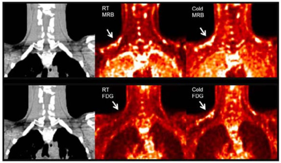 11C-MRB. Norepinephrine is a major signal molecule regulating the metabolic activity in BAT. In 2012, Ding et al. performed a PET study in rats with 11C-MRB, which is a targeting norepinephrine transporter. Their results demonstrated that 11C-MRB could efficiently bind to BAT at thermoneutral conditions and the thermo-stimulating conditions had no significant effect on the tracer uptake, while 18F-FDG contrast could be observed only under cold conditions [64]. In 2015, they continued their study in humans with ten healthy Caucasian subjects [65]. Similar to the results of animal studies, the subjects showed equal BAT uptake under both room temperature and cold conditions (Figure 1). Their results indicated the possibility of using 11C-MRB for the monitoring of BAT mass in the development and treatment of metabolic disorders, such as obesity and diabetes. However, the human study has some limitations, including a small sample size, short half lifetime of 11C-labelled tracer, and low signal to noise ratio in human subjects. Additional studies are needed to determine its validity for BAT mass imaging both in rodents and human.
