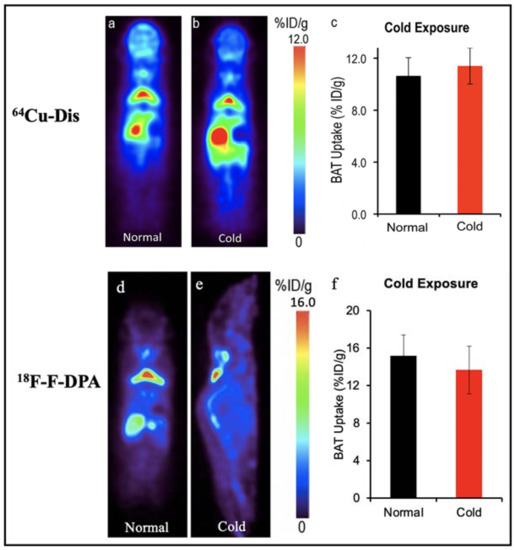 64Cu-Dis, 18F-F-DPA and 11C-PBR28. Our group have reported a synthesis-free PET imaging strategy for BAT mass [58]. After a top-down screening with a number of 64Copper ligands through a PET scanner, we found that the combination of 64CuCl2 with an FDA-approved drug for alcoholism, disulfiram, provided a considerable high contrast for BAT, and named the tracer as 64Cu-Dis. Importantly, the high BAT uptake of 64Cu-Dis was not affected by BAT activation (Figure 2). Interestingly, we found that TSPO, a transport protein located on the outer mitochondrial membrane, was the binding target of 64Cu-Dis. Although there is no published data regarding 64Cu-Dis use in humans, the high accumulation in BAT and the easy-to-use protocol (by only two step injection) suggested that 64Cu-Dis was a very promising PET tracer for quantitative BAT mass imaging.