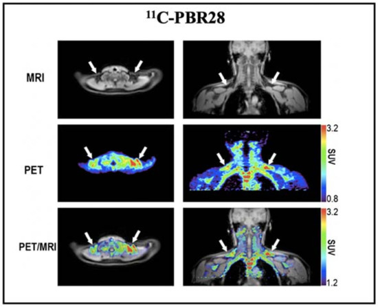 BAT imaging with TSPO PET tracer: 11C-PBR28. Representative images of a healthy volunteer who underwent PET/MRI using 11C-PBR28. The images were obtained 60–90 min after 14 m Ci of 11C-PBR28 injection. The supraclavicular BAT depots are indicated with arrows. Reproduced data with permission from reference [64].