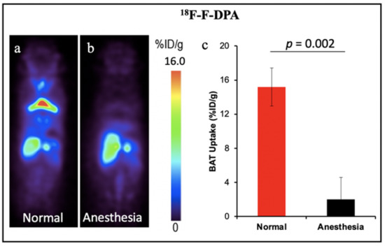 BAT imaging with TSPO PET tracer 18F-F-DPA: (a) PET imaging with 18F-F-DPA in mouse under room temperature. (b) Representative coronal image under light anesthesia for 30 min before tracer injection. (c) Quantitative analysis of (a,b). There was a significant difference in uptake between the control and anesthesia treated groups.