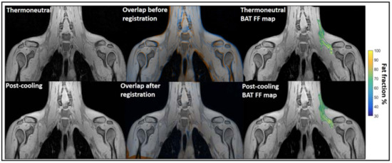 Example of image registration and a reconstructed fat fraction map before and after cooling. The first column shows thermoneutral and post-cooling images (one slice from the first echo in the acquisition). In the second column, the overlay of the same images before (top) and after registration (bottom) is shown. The images are colored orange (thermoneutral) and blue (post-cooling) for better visualization of differences between the scans. The third column shows the thermoneutral and post-cooling fat fraction maps of the supraclavicular adipose depot, overlaid on the corresponding images. Lipid content in the supraclavicular region is color-mapped over a 30–100% fat fraction range. Reprinted with permission from reference [85]. Copyright © 2021 Abreu-Vieira, Sardjoe Mishre, Burakiewicz, Janssen, Nahon, van der Eijk, Riem, Boon, Dzyubachyk, Webb, Rensen and Kan.