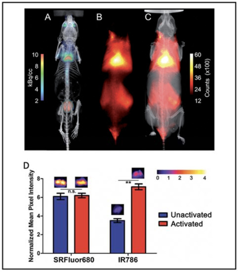 BAT imaging with micellar SRFluor680. (A) Representative PET/CT with 18F-FDG in a single living SKH1 mouse. (B,C) Fluorescence/X-ray images of the same SKH1 mouse with micellar SRFluor680. (D) Effect of BAT metabolic activation on probe accumulation. Representative fluorescence images of the excised BAT are shown above each of the bars. Note: n.s. (not significant), ** (p < 0.01). Reproduced from reference [103] with permission from the Royal Society of Chemistry.