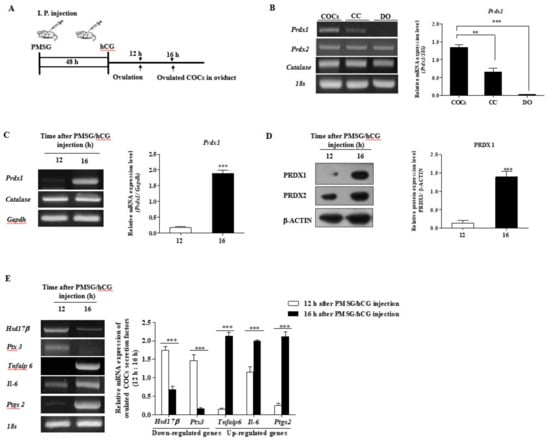 Changes in the Prdx1 gene and secretion factor expression patterns from ovulated cumulus–oocyte complexes (COCs) at 12 and 16 h after pregnant mare serum gonadotropin (PMSG)/hCG injection. (A) Schematic diagram of hormone-induced superovulation in mice: 12 or 16 h after PMSG-hCG injection, ovulated COCs were obtained from the oviducts. (B) Expression levels of antioxidant enzymes (Prdx1, 2, and Catalase) in COCs, CC, and DOs were measured by RT-PCR analysis. (C) The mRNA levels of Prdx1 and catalase as antioxidant enzymes in isolated COCs were measured by RT-PCR analysis. The mRNA levels of these genes were normalized to the Gapdh expression level as a control. (D) Protein expression levels of PRDX1 and PRDX2 in isolated COCs were measured by Western blot analysis. The levels of PRDX 1 and 2 were normalized to β-ACTIN expression level as a control. (E) The mRNA expression levels of ovulated COC-secreted factors (downregulated genes: Hsd17β and Ptx3; upregulated genes: Tnfaip6, Il-6, and Ptgs2) in isolated COCs were measured by RT-PCR analysis. The mRNA levels of these genes were normalized to the 18S expression level as a control. The histogram represents the values of the densitometry analysis that were obtained using Image J software. The data are representative of at least three independent experiments conducted in triplicate and shown as means ± SEM (30 COCs per group). **, p < 0.01; ***, p < 0.001 for analyses of these data via t-tests compared with 12 h after PMSG/hCG injection, and via Dunnett’s multiple comparison test compared with the COC sample.