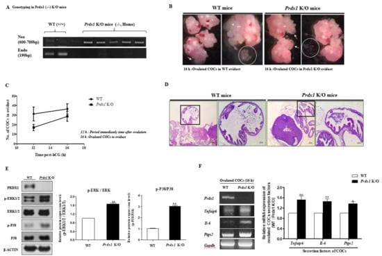 The genotypes of Prdx1 K/O mice were confirmed by PCR analysis, and a band of the Neo gene was represented in 600–700 bp versus 190 bp in the WT (Figure 5A). We observed that the Prdx1 K/O (−/−) mice had some characteristic differences in ovulation and the number of ovulated COCs compared with female WT mice shown by H&E staining and microscope image data (Figure 5B–D). As shown in Figure 5B,C, the COCs collected from the oviducts of Prdx1 K/O mice 16 h after a PMSG/hCG injection were an indication that ovulation still occurred, but the formation or number of COCs showed several abnormalities. In WT mice, the CCs of ovulated COCs were well structured (Figure 5D, left panel), with CCs radiating from a central oocyte. On the contrary, we observed an abnormal pattern of CC expansion in ovulated COCs in the oviduct of Prdx1 K/O mice (Figure 5D, right panel). In addition, we investigated the p-ERK1/2, ERK1/2, p-P38, and P38 protein levels using Western blotting analysis in the COCs of Prdx1 K/O mice to determine the changes in TLR4-derived p38 and ERK1/2 signaling induced by Prdx1 deficiency in ovulated COCs. As shown in Figure 5E, the protein expression levels of p-ERK1/2 and p-P38 increased significantly (p < 0.01) in the ovulated COCs of Prdx1 K/O mice. These observations indicate that the p38 and ERK1/2 signaling pathways increased the in vivo levels of ovulated COCs in Prdx1 K/O compared with WT mice. The mRNA expression of Tnfaip6, Il-6, and Ptgs2 increased in the ovulated COCs of Prdx1 K/O compared with WT mice 16 h after PMSG/hCG injection (Figure 5F).