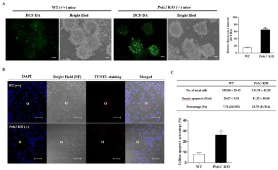 ROS production and cellular apoptosis according to Prdx1 gene deficiency in the ovulated COCs of Prdx1 K/O mice. (A) Investigation of intracellular ROS production in ovulated COCs by Prdx1 deletion. COCs of Prdx1 K/O and WT mice were incubated in a culture medium (M16, Sigma) with 1.0 μg/mL DCF-DA for 15 min (scale bar = 50 μm). (B,C) Detection of cellular apoptosis in CCs of ovulated COCs in Prdx1 K/O mice, with Hoechst 33342 staining identifying nuclei, TUNEL staining identifying apoptotic cells, and a merged photograph of Hoechst 33342 and TUNEL-stained ovulated COCs (20×; scale bar = 50 mm) of Prdx1 K/O mice. The quantification of fluorescence intensity in DCF-DA- and TUNEL-stained COCs was obtained using the Image J program. Data in the bar graph represent the means ± SD of three independent experiments. *, p < 0.05; **, p < 0.01 compared with WT mice.