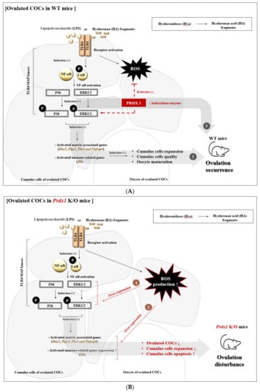 (A) WT mice: Roles of PRDX1 in cytokine secretion function and the ovulatory process associated with the TLR4-derived ERK1/2 MAP kinase activity in the ovulated COCs of mice, showing the effect of PRDX1 on the secretory functions (Tnfaip6, Il-6, and Ptgs2) of cumulus cells, leading to ovulation by activation of TLR4-mediated ERK signaling in ovulated COCs. (B) Prdx1 K/O mice: In the present study, these observations demonstrated novel evidence of the effects of Prdx1, as a directly upregulated response to ERK1/2 signaling for regulating ROS production, on the secretory functions of cumulus cells by TLR4 pathways in ovulated COCs from Prdx1 K/O mice.