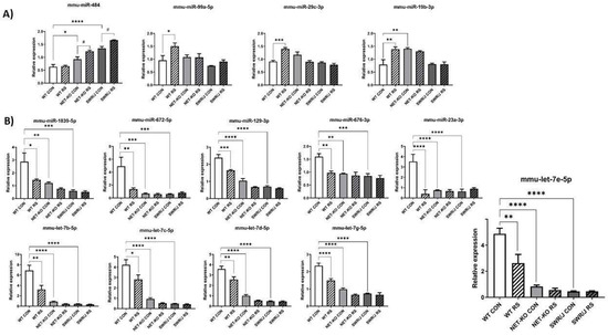 The expression of miRNAs in the prefrontal cortex (PFC) of three genotypes of mice following restraint stress (RS). (A,B) show the expression of miRNAs that were altered upon RS. WT—wild-type mice; NET-KO—norepinephrine transporter knock-out mice; SWR/J—Swiss mice. CON—control group; RS—restraint stress group. * p ≤ 0.05, ** p ≤ 0.01; *** p ≤ 0.001; **** p ≤ 0.0001; # p ≤ 0.05; n = 4.