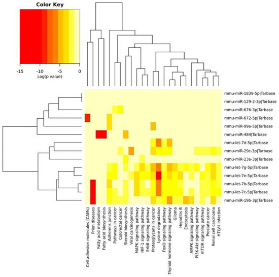 The heatmap indicating the associations of miRNAs with the KEGG pathways. The miRNAs are on the right-hand side, while the KEGG pathways are at the bottom of the map. The significances of linking miRNAs to the KEGG categories are color-coded (the scale in the upper-left corner).