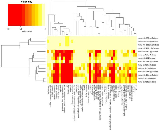 The heatmap indicating the associations of miRNAs with the GO annotations. The miRNAs are on the right-hand side, while the GO annotations are at the bottom of the map. The significances of linking miRNA to GO annotations are color-coded (the scale in the upper-left corner).