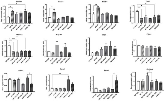 The Custom TaqMan Gene Expression Array Cards were used to determine the expression level of the mRNAs. The 32 primers that were placed on the array cards were selected mainly based on in silico analyses (Supplement S1). The mRNAs expression of four samples in triplicates was analyzed using one array card. The cDNA transcripts for RT-qPCR reactions were synthesized according to the manufacturer’s protocol using a High Capacity cDNA Reverse Transcription Kit (Thermo Fisher Scientific, Waltham, MA, USA). The obtained cDNA was mixed with TaqMan Universal PCR Master Mix, No AmpErase UNG (Thermo Fisher Scientific, Waltham, MA, USA) to perform the RT-qPCR reactions. The RT-qPCRs were run on a QuantStudio 12K Flex System (Applied Biosystems, Waltham, MA, USA). Data were further analyzed with the QuantStudio 12K Flex software (Applied Biosystems, Waltham, MA, USA). Ct values above 34 were considered to represent undetectable mRNAs. The same threshold equal to 0.2 was set for all samples for comparison. Then, the data of selected mRNAs were analyzed with a modified Pfaffl equation for multiple reference genes [37]. The beta-actin (Actb) and glyceraldehyde-3-phosphate dehydrogenase (Gapdh) were selected for normalization. Afterward, statistical analysis was carried out with GraphPad Prism 8.4.2 ( GraphPad Software, San Diego, CA, USA) using two-way ANOVA (Tukey’s post hoc test for multiple comparisons between groups) to compare each mRNA expression change between genotypes under control conditions and following RS. A value of p ≤ 0.05 was considered to be significant.