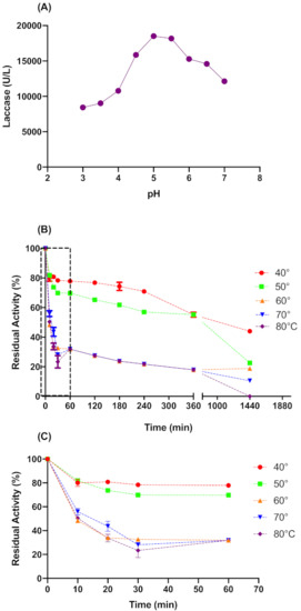 Optimum pH for catalytic activity (A) and thermal stability of L. sajor-caju crude laccase in longer times (B) and extension of shorter times (C). The buffer solutions for optimum pH assay were used according to their buffer range: Sodium Acetate (3–5) and Sodium Phosphate (6–8).