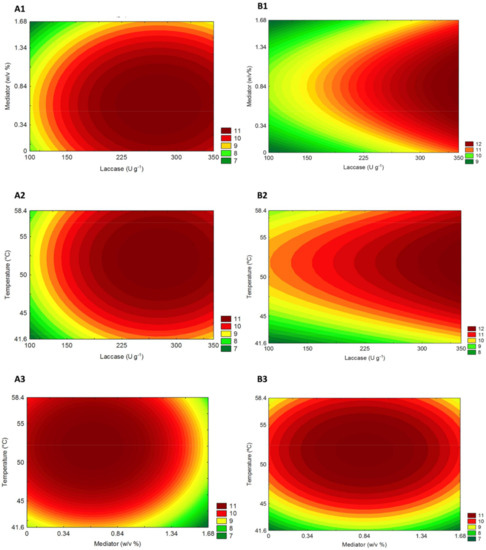The interaction between independent variables and their independent influence on sugar yields of P. maximum biomass after laccase pretreatment was graphically denoted by response surfaces. The contour curves (Figure 3) created based on the models described above show similar trends related to sugar yields (g L−1) for both climate conditions. The highest sugars yields found for C Figure 3 (A1–3) and eT+eC Figure 3 (B1–3) occur at intermediate to higher levels of laccase and temperature but in a lower concentration of Vanillin mediator.
