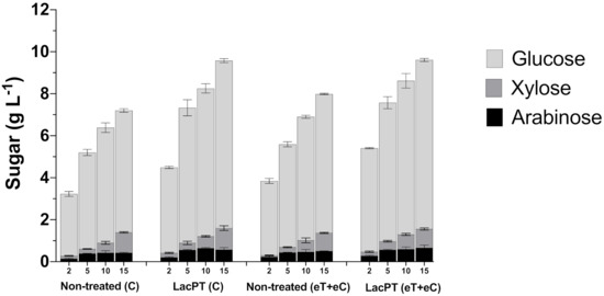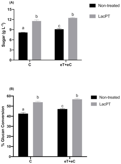 Also, the relative increase in sugar yields between pretreated and non-treated biomass showed to be higher for the C group in relation to eT+eC substrates (Figure 4, Figure 5, Figure 6 and Figure 7). This result indicates that laccase action was more advantageous to the C group, probably because this climate condition has a more recalcitrant structure than eT+eC for raw biomass [38]. Therefore, laccase pretreatment assisted in overcome these differences approximating the bioenergetic potential of both climate conditions.