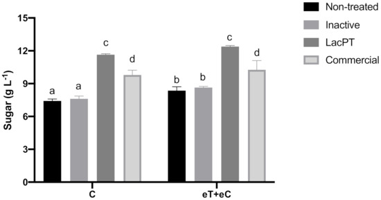 To further prove the positive effect of crude laccase pretreatment on hydrolysis sugar yields, we compared the sugar amount obtained for laccase pretreated with the ones resulted after pretreatments applying commercial laccase and inactive crude laccase (Figure 5). The experiments were performed at the same optimum parameters previously obtained in the CCD experiment and at the same hydrolysis conditions. As a result, the total sugar yields to inactivate crude laccase pretreated biomass, 7.81 and 8.48 g L−1 for C and eT+eC, respectively, were similar to the ones found in non-treated biomass, showing that the positive effects on sugar yields for laccase pretreated substrate are due to enzyme activity present on the crude extract of L. sajor-caju. Moreover, the commercial laccase pretreated samples showed significantly lower (p < 0.05) levels of sugar yields related to crude laccase, 9.8 and 10.26 g L−1 for C and eT+eC, respectively, which demonstrate that the use of crude laccase has costs and operational advantages.