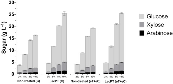 The above-described increments for laccase pretreated biomass result in significantly higher (p < 0.05) concentration of fermentable sugars in the hydrolysate yielding from 3.6 to 20.5 g L−1 of glucose for the C group and from 3.7 to 20.7 g L−1 for the eT+eC group, depending on the solid load applied. In addition, xylose was released in satisfactory concentration for both C and eT+eC groups, reaching 3.4 and 3.5 g L−1, respectively, at 10% solid.