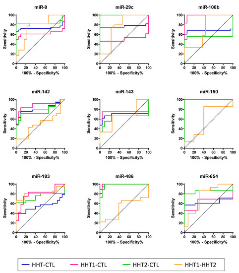 Nonetheless, we wanted to determine the strength of these miRNAs as biomarkers of HHT. Thus, the receiver operating characteristic (ROC) curve and area under the ROC curve (AUC) analysis was used to evaluate their predictive ability. We carried out all comparisons with respect to the control group (Figure 5). AUC values demonstrated that most of the miRNAs analyzed from the selected profile are good (AUC > 75%) and excellent (AUC > 90%) biomarkers for HHT, even allowing us to distinguish between HHT1 and HHT2 (Table 2). However, we found that although miR-143 is increased in plasma exosomes from HHT1 patients, it cannot be considered a biomarker since its AUC is lower than 75%.