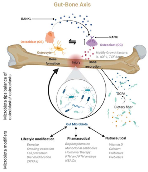 The healing of bone after a fracture is unlike the healing of other organs in the body. Bone is unique in that it heals without the formation of a fibrous scar due to its cellular makeup. After a fracture, a series of processes allow the bone to create a new matrix and structurally and functionally restore the defect. These healing processes are initiated through cell signaling cascades, during which the increased blood flow caused by inflammation allows the infiltration of cells, nutrients, and growth factors to the wound bed, essential elements to begin the healing process [1]. Thus, bone healing can be compromised by conditions that influence and alter natural cell signaling cascades in gut microbiota dysbiosis [2,3]. While microbial dysbiosis is now being recognized as a significant contributor to many human disease states [4,5], its contribution to perturbations in bone remodeling and healing, such as in osteoporosis and osteopenia [6], has only recently been recognized, although it cannot be underestimated.