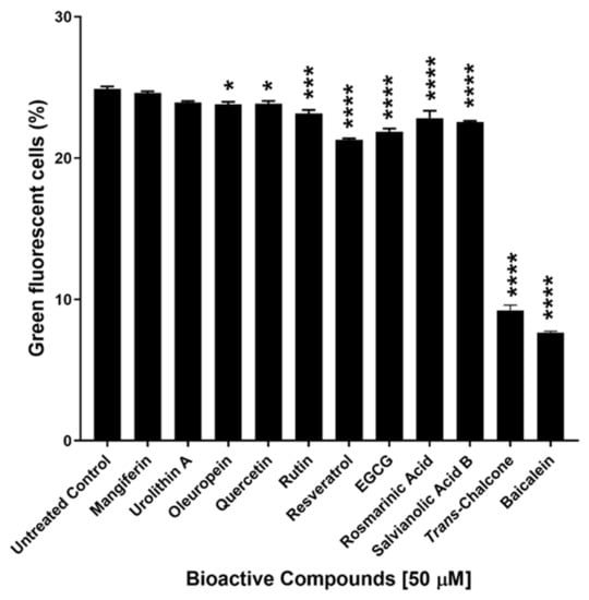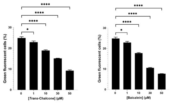 2.1. Baicalein and Trans-Chalcone Were the Most Effective Compounds to Reduce Green Fluorescent Cells