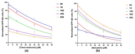 Gaussian curves obtained by plotting the normalized GFP-Aβ42 positive cells in percentages when the BY4743 Δahp1 [p416.GPD.GFPAβ42] cells were treated with (a) combinations of 0, 1, 10, 30 and 50 µM trans-chalcone with constant concentrations of baicalein at 0, 1, 10, 30 and 50 µM represented by curves 0B, 1B, 10B, 30B and 50B, respectively, and (b) combinations of 0, 1, 10, 30 and 50 µM baicalein with constant concentrations of trans-chalcone at 0, 1, 10, 30 and 50 µM represented by curves 0C, 1C, 10C, 30C and 50C, respectively. The total GFP-Aβ42 producing cells in the untreated control were normalized to 100% and used for comparison with the treated populations.