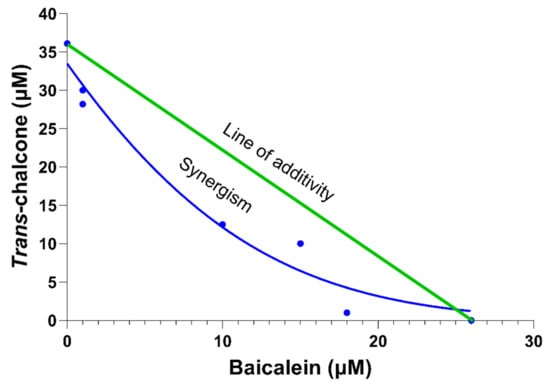 Using the curves from Figure 3, the 50% inhibitory dose (IC50) for the combinations of baicalein and trans-chalcone were determined. An isobologram was created to assess underlying relationship between the two compounds (Figure 4). From Figure 4, it can be deduced that the baicalein and trans-chalcone acted in synergy, shown by the increased effect when used in combination [].