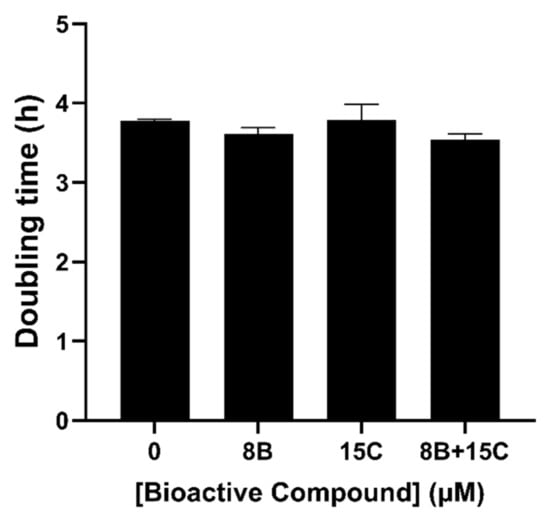 Doubling time of BY4743 [pYEX.Aβ] after exposure to 8 μM baicalein (8B), 15 µM trans-chalcone (15C) and their combination (8B + 15C) in minimal media supplemented with the auxotrophic requirements of the strain.