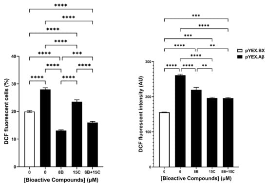 Effect on intracellular reactive oxygen species (ROS) in BY4743 [pYEX.Aβ] cells treated with 8 µM baicalein (8B), 15 µM trans-chalcone (15C) and their combination (8B + 15C). pYEX.BX represents data obtained from BY4743 [pYEX.BX] empty vector control and pYEX.Aβ represents data obtained from BY4743 [pYEX.Aβ] transformants. Left panel shows the change in percentage of dichlorofluorescein (DCF) fluorescent cells and right panel shows the median DCF fluorescence intensity differences between the treatments. Statistically significant values obtained by one-way ANOVA analysis are represented by asterisks (** p < 0.01, *** p < 0.001 and **** p < 0.0001).