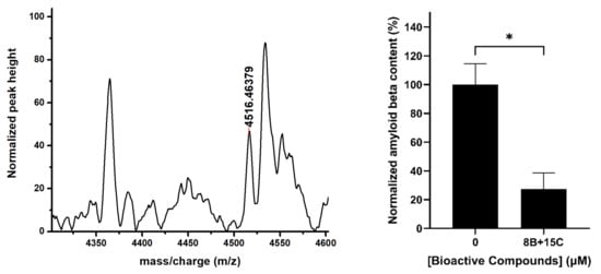Quantification of intracellular Aβ42 in BY4743 [pYEX.Aβ] cells treated with trans-chalcone and baicalein. Left panel showing mass spectrum of cell lysate protein peaks near the expected molecular weight (4516 Da) of Aβ42 obtained from MALDI-TOF MS. Right panel shows levels of Aβ42 protein in BY4743 [pYEX.Aβ] cells treated with the combination of 8 μM baicalein and 15 μM trans-chalcone (8B + 15C). Statistically significant values obtained from unpaired t-test for difference in mean are represented by asterisks (* p < 0.05).