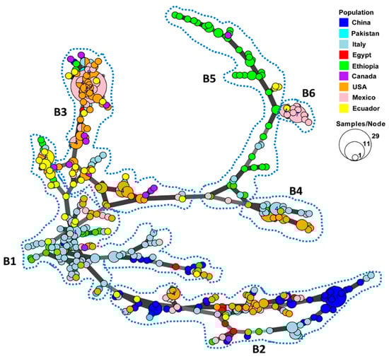 Minimum spanning network showing relationships among multi-locus genotypes (MLGs) of Puccinia striiformis f. sp. tritici identified from nine countries. Each node represents a different MLG. The size of a node indicates the number of isolates in the MLG. Node colors represent countries from which the isolates were collected. Six major branches are marked by the broken close lines. B1–B6, branch 1–branch 6.