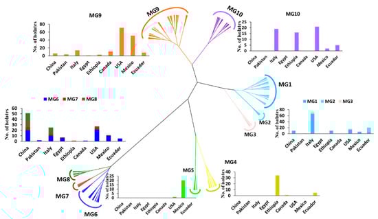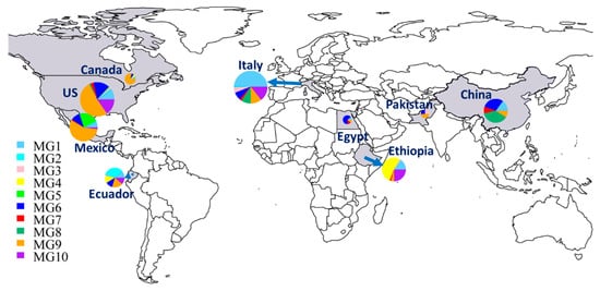 In addition to the numbers and frequencies of isolates of each MG in each country (Table 1), the proportional presence of MGs in each country can be easily seen in a map (Figure 3). The Chinese collection comprised 37.3% MG8 isolates, followed by 29.9% MG6, 14.9% MG1, 9% MG7, and 9% MG9, but did not have any isolates in MG2 to MG5 or MG10. The small collection from Pakistan had isolates in only three MGs: 50% in MG9 and 25% each in MG3 and MG6. Eight MGs were detected in Italy, including MG1 (50%), MG10 (14.4%), MG9 (10.6%), MG8 (9.1%), MG6 (7.6%), MG3 (5.3%), MG7 (2.3%), and MG2 (0.8%). Nine isolates from Egypt were identified as MG6 (66.7%) and one isolate (11.1%) each in MG1, MG7, and MG9. Six MGs were detected in Ethiopia, including MG4 (52.3%), MG10 (24.6%), MG1 (15.4%), MG9 (4.6%), and MG3 and MG7, each at 1.5%. The Canadian isolates were identified mostly as MG9 (78.6%), with only one isolate (7.1%) each in MG1, MG4, and MG6. Seven MGs were detected in Mexico, including MG9 (56%), MG5 (22%), MG6 (11%), MG1 (6.6%), MG10 (2.2%), and MG2 and MG7, each with only one isolate (1.1%). The Ecuador isolates were identified as MG2 (34.1%); MG9 (18.2%); MG1, MG4, MG6, and MG10 (11.4% each); and MG3 (2.3%). The selected U.S. isolates were identified in all MGs except MG4, with 51.8% in MG9, 15.3% each in MG6 and MG10, 9.5% in MG1, 2.9% in MG7, 2.2% in MG3, 1.5% in MG8, and 0.7% in both MG2 and MG5.