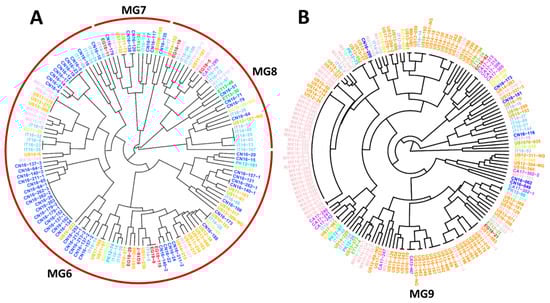 Dendrograms of major molecular groups (MGs) of Puccinia striiformis f. sp. tritici showing genetically related isolates from different countries. (A) Dendrogram of isolates in MG6, MG7, and MG8. (B) Dendrogram of isolates in MG9. These dendrograms were constructed based on dissimilarities assessed with 14 simple sequence repeat markers (SSR) using hierarchical cluster analysis.