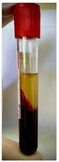 The patient’s blood was drawn from a median cubital vein and collected in glass tubes (each 10 mL). Next, the patient’s blood was centrifugated at 1200 rpm for 8 min in the Neuation iFuge D06 Premium Edition (Neuation Technologies Pvt., Gandhinagar, Gujarat, India) centrifuge to obtain advanced platelet-rich fibrin (A-PRF). Figure 2 presents the probe with the obtained A-PRF after centrifugation.