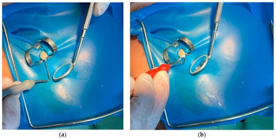 Application of A-PRF with a Machtou hand plugger: (a) initial A-PRF application with a grey Machtou hand plugger; (b) application of A-PRF with a red Machtou hand plugger below the cementodentinal junction.