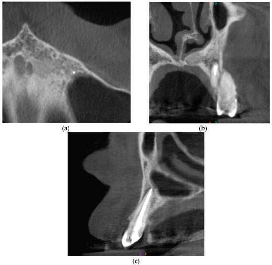 Preoperative cone beam computerized tomography (CBCT) images presenting the periapical lesion around the root of tooth no. 23 (date of CBCT examination: 22 May 2020): (a) axial view; (b) coronal view; and (c) sagittal view.